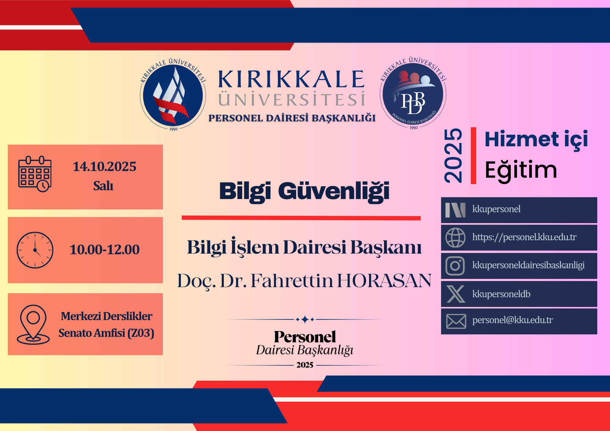 Üniversitemiz Senatosunun 28.01.2015 tarihli ve 02/5 sayılı kararı ile yürürlüğe giren Hizmet İçi Eğitim Yönergesi kapsamında, Üniversitemiz personelinin iş süreçlerini yürütmesinde gerekli olan bilgi ve becerinin kazandırılması, değişen mevzuat ve uygulamalara uyum sağlanması ile verimli çalışma ortamının oluşturularak kurumsal koordinasyonun etkin kılınması amacıyla gerçekleştirilmesi planlanan "2025 Yılı Hizmet İçi Eğitim Programı" kapsamında, Üniversitemiz Bilgi İşlem Dairesi Başkanı olarak görev yapan Doç. Dr. Fahrettin HORASAN tarafından yapılacak olan “Bilgi Güvenliği” konulu eğitim 14 Ekim 2025 tarihinde Merkezi Derslikler (Z03) No’lu senato amfisinde gerçekleştirilecektir.