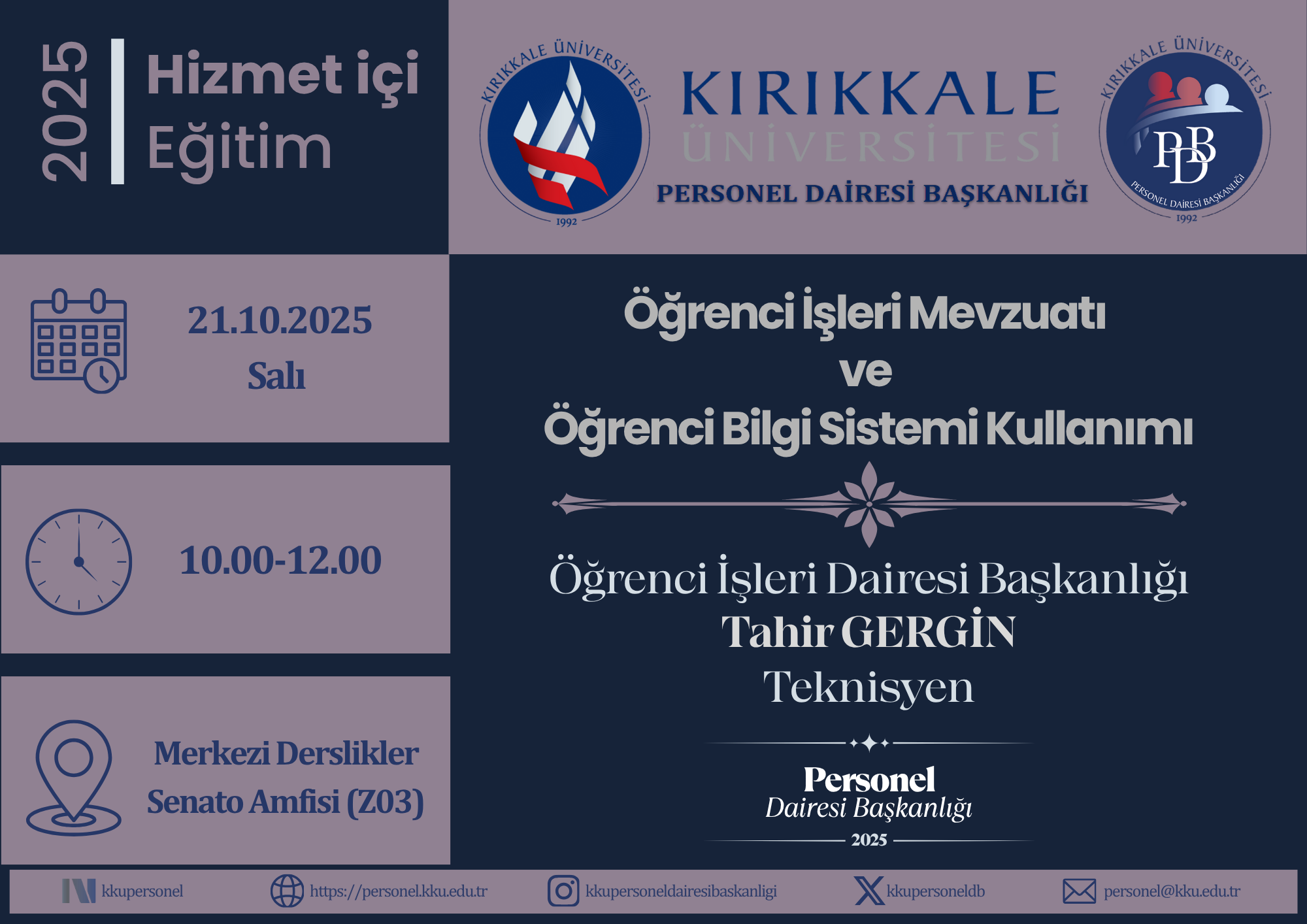 Üniversitemiz Senatosunun 28.01.2015 tarihli ve 02/5 sayılı kararı ile yürürlüğe giren Hizmet İçi Eğitim Yönergesi kapsamında, Üniversitemiz personelinin iş süreçlerini yürütmesinde gerekli olan bilgi ve becerinin kazandırılması, değişen mevzuat ve uygulamalara uyum sağlanması ile verimli çalışma ortamının oluşturularak kurumsal koordinasyonun etkin kılınması amacıyla gerçekleştirilmesi planlanan "2025 Yılı Hizmet İçi Eğitim Programı" kapsamında, Üniversitemiz Öğrenci İşleri Dairesi Başkanlığında Teknisyen olarak görev yapan Tahir GERGİN tarafından yapılacak olan “Öğrenci İşleri Mevzuatı ve Öğrenci Bilgi Sistemi Kullanımı” konulu eğitim 21 Ekim 2025 tarihinde Merkezi Derslikler (Z03) No’lu senato amfisinde gerçekleştirilecektir.
